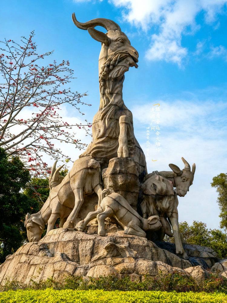 越秀公园内的五羊雕塑,是广州“羊城”“穗城”别称的由来。130多块花岗岩雕刻而成的五只山羊形态生动,再现了“五羊衔谷,萃于楚庭”的古老传说,是广州最具代表性的地标。
